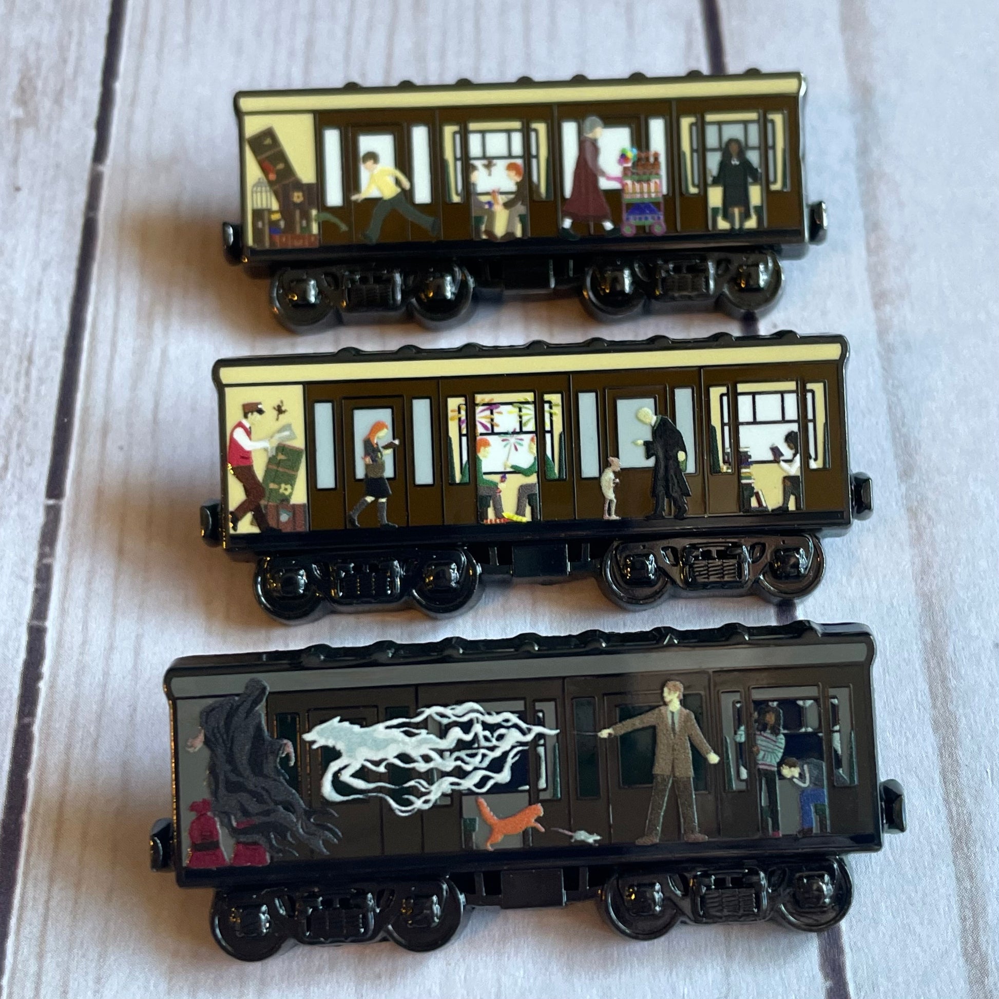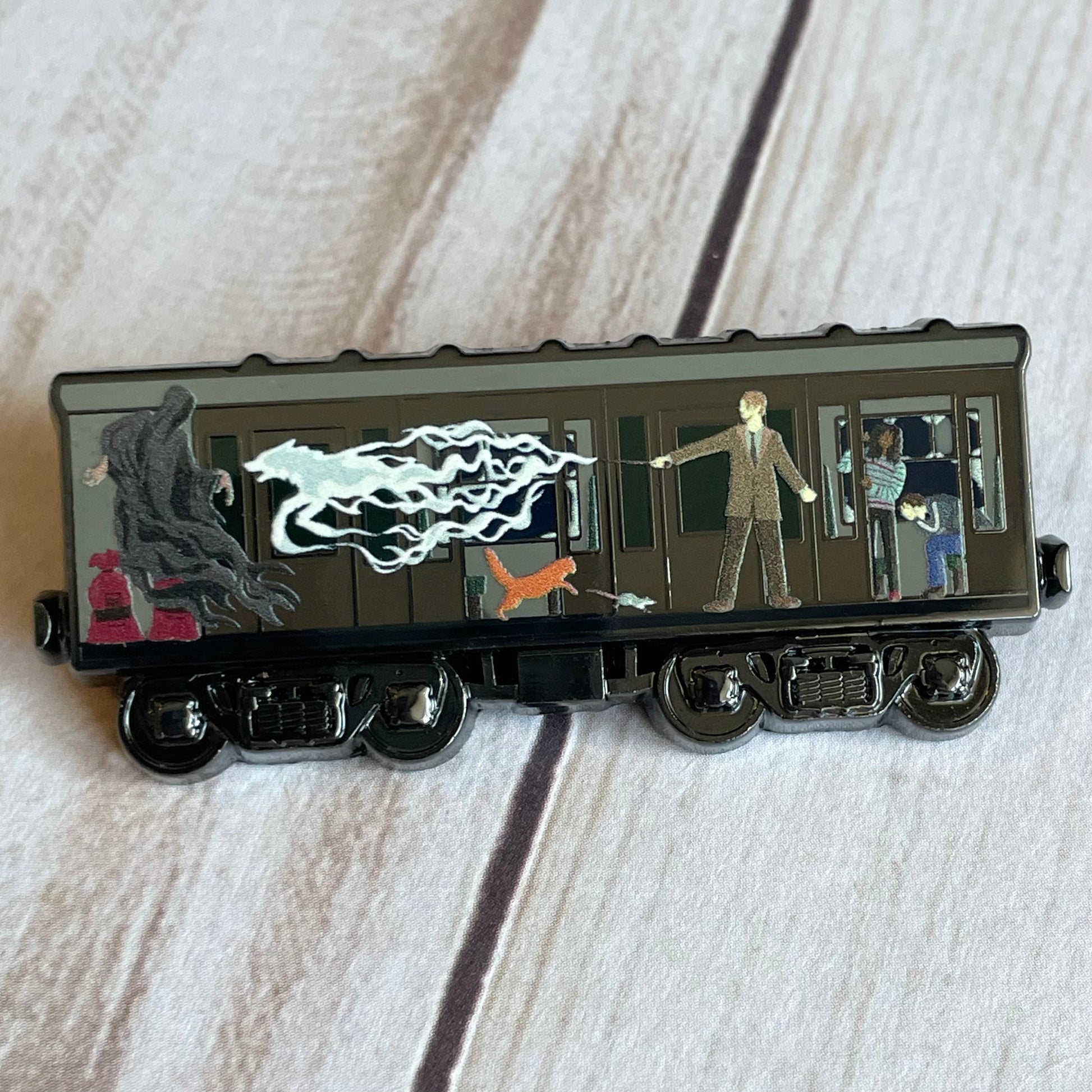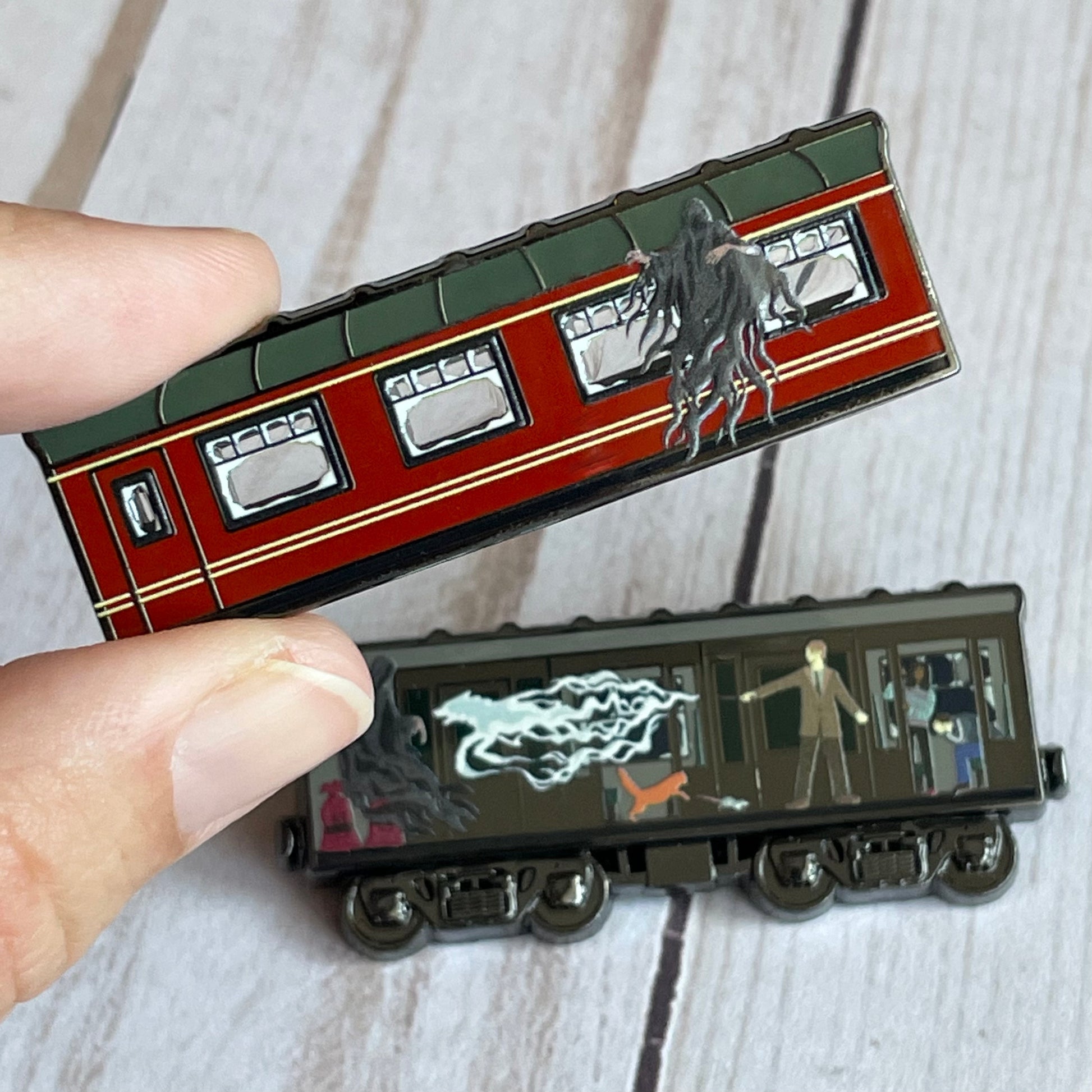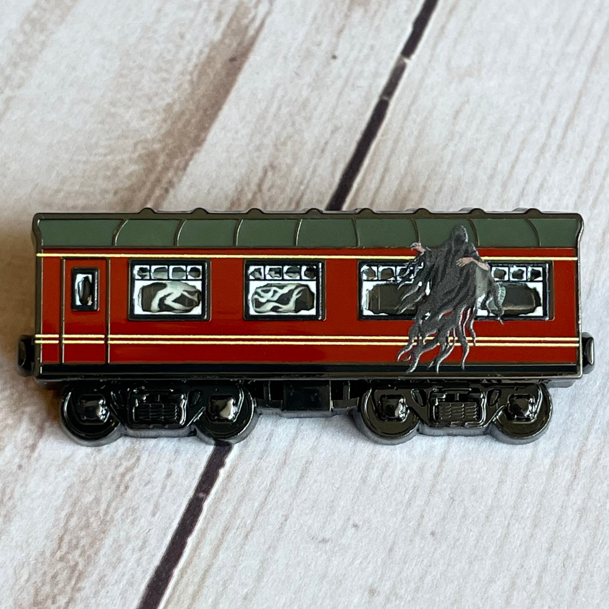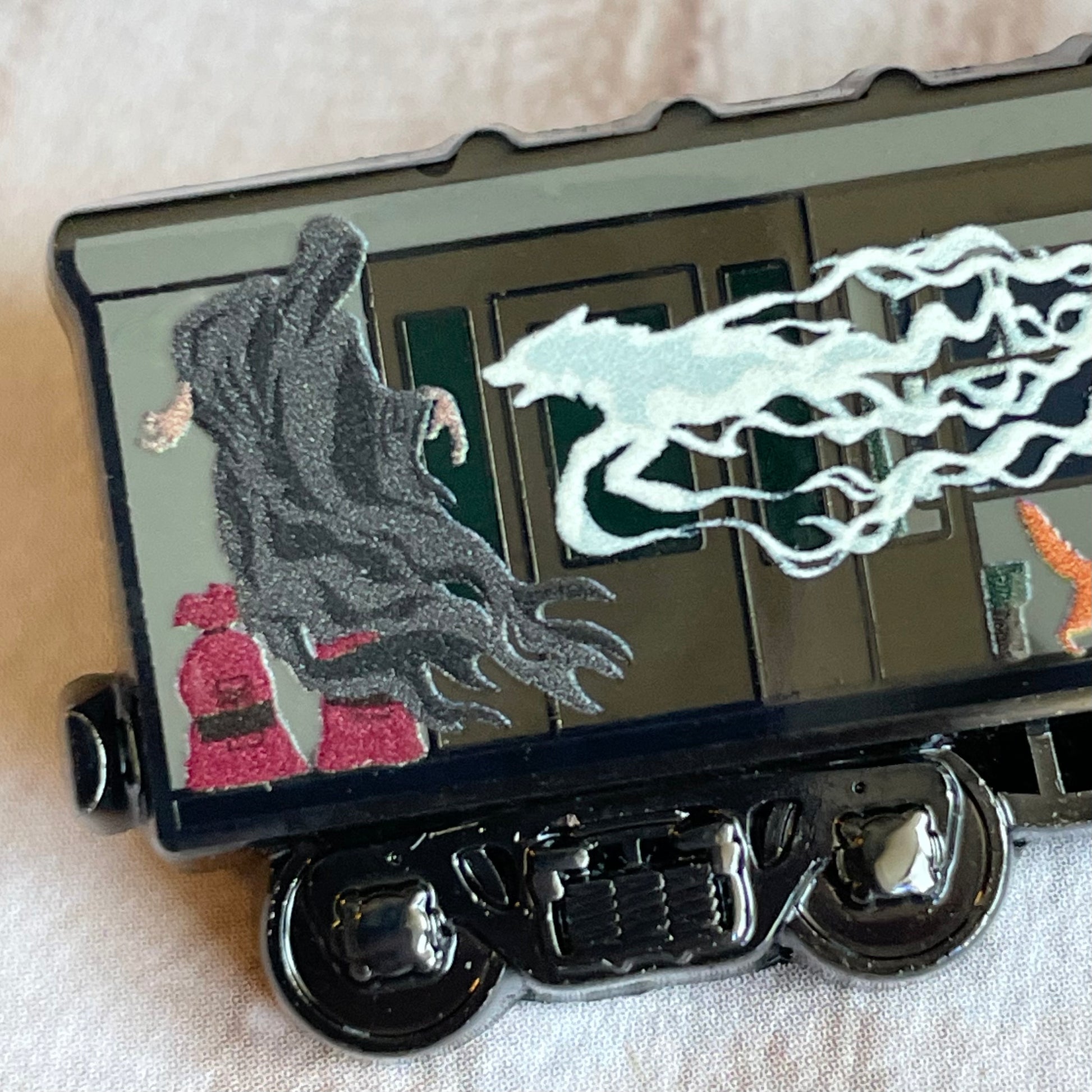 This double layer pin and has a removable magnetic front that opens to show some spooky visitors on in the train.