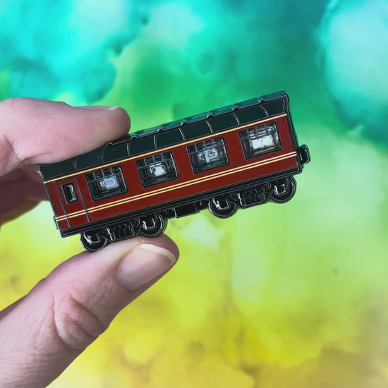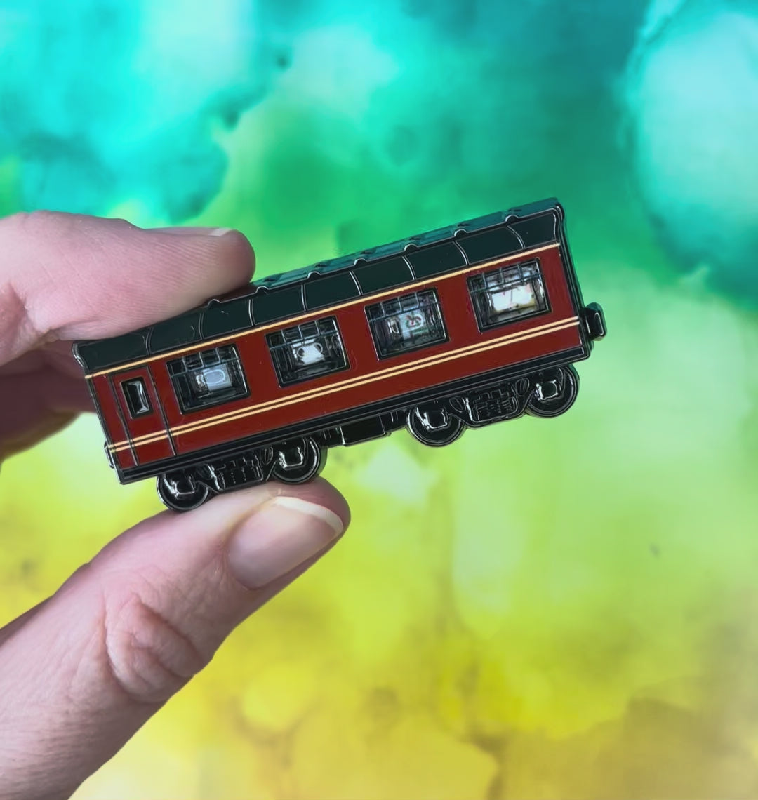 This double layer pin and has a removable magnetic front that opens to show treats and treasures on in the train.