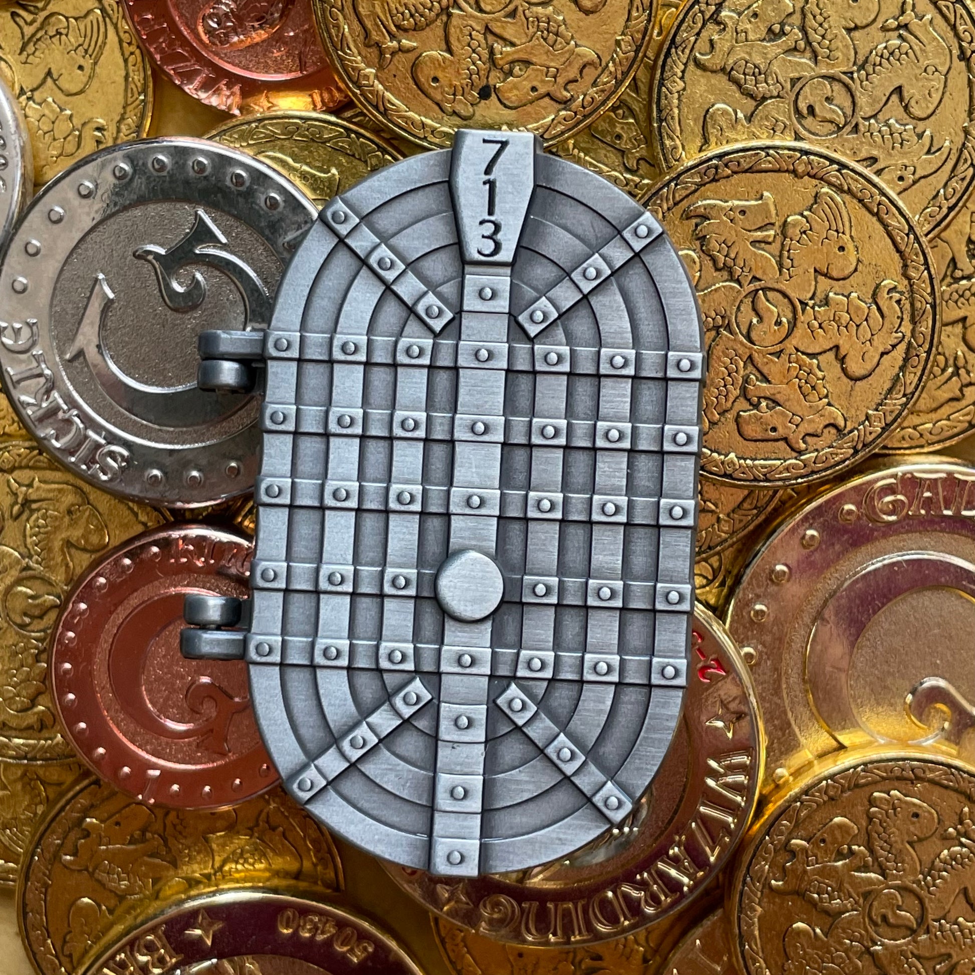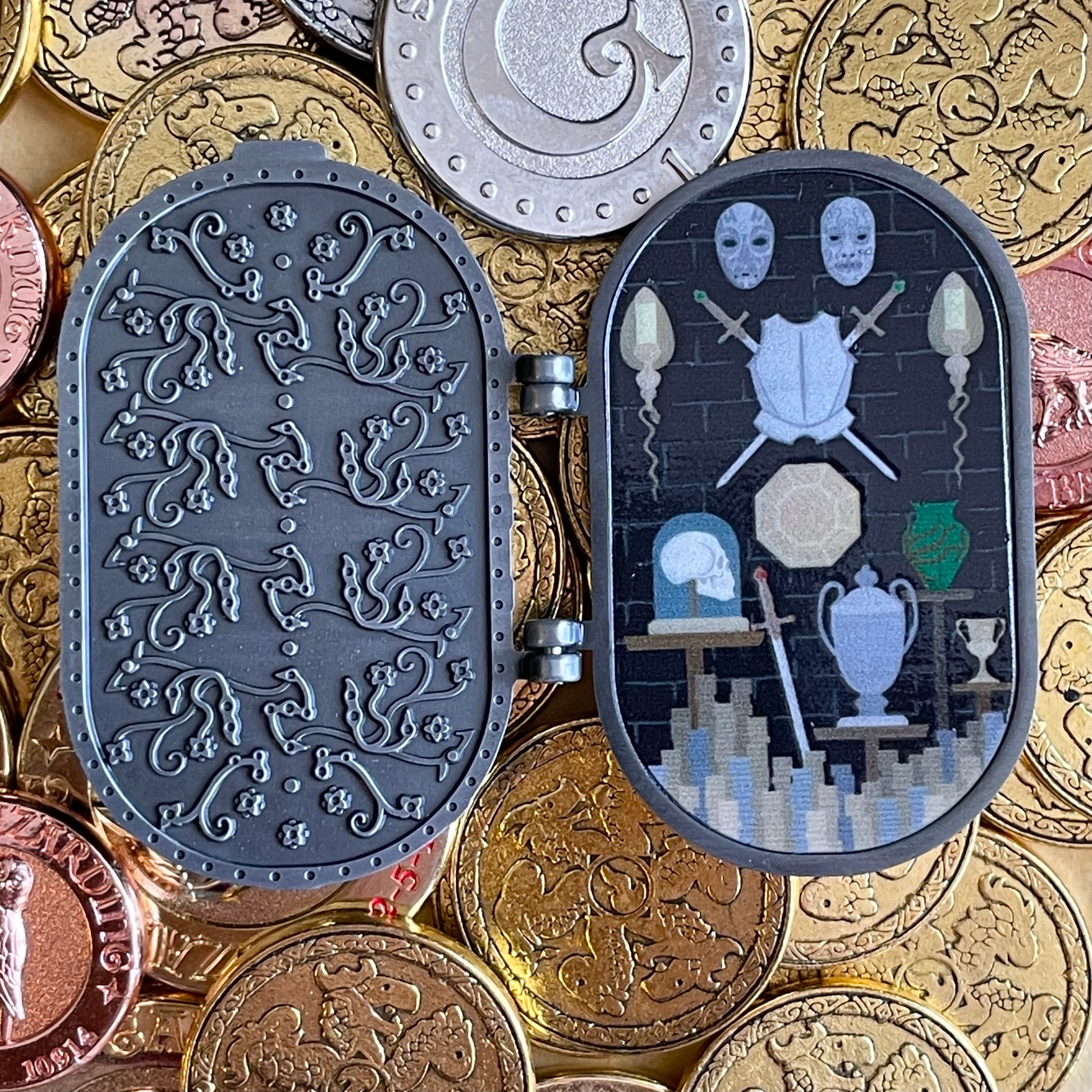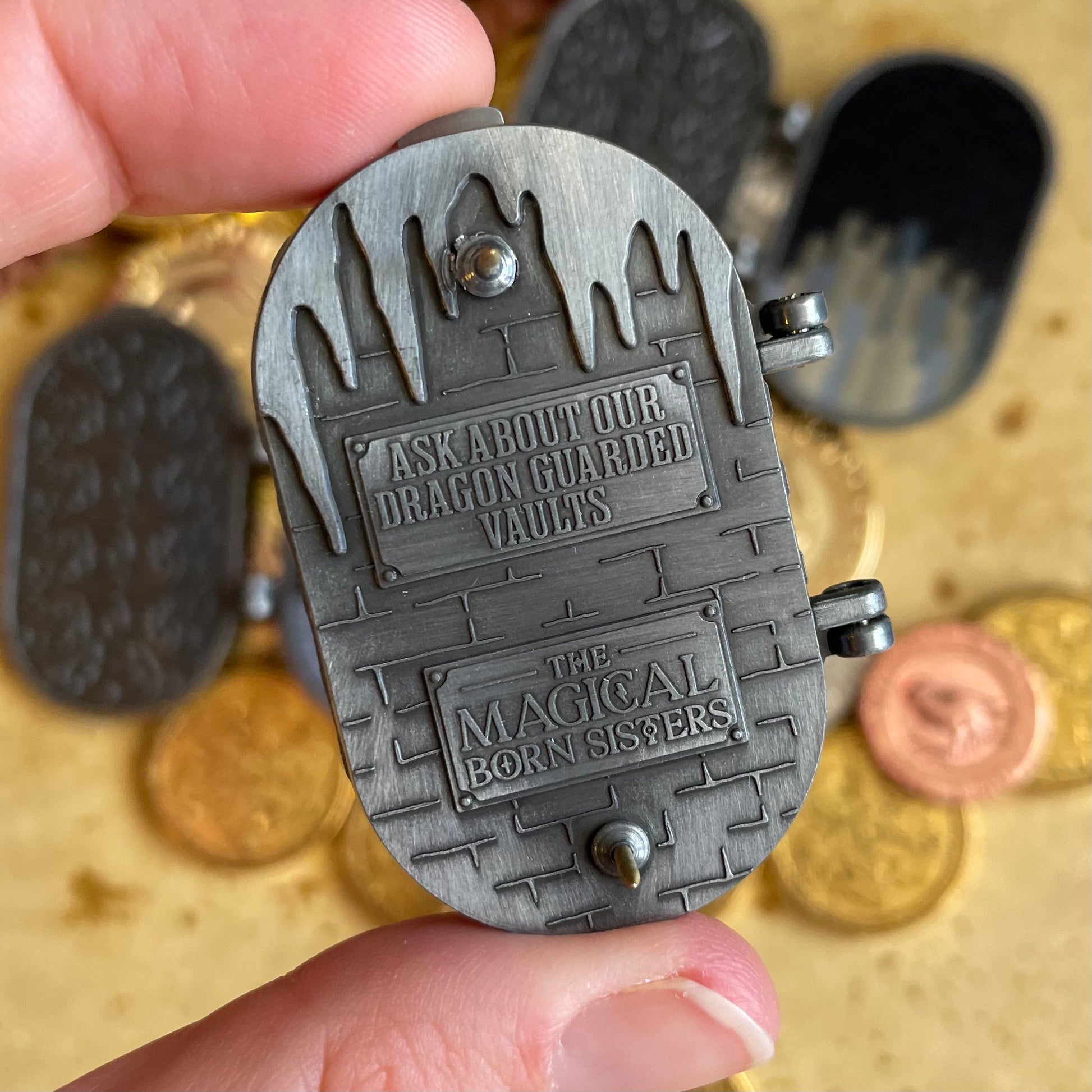 This hinged pin comes in three variations each featuring a famous magical vault!