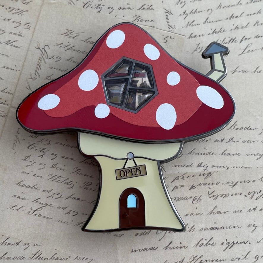 Each mushroom village pin is two pieces with inset magnets, with a removable mushroom "cap" that reveals the scene inside.